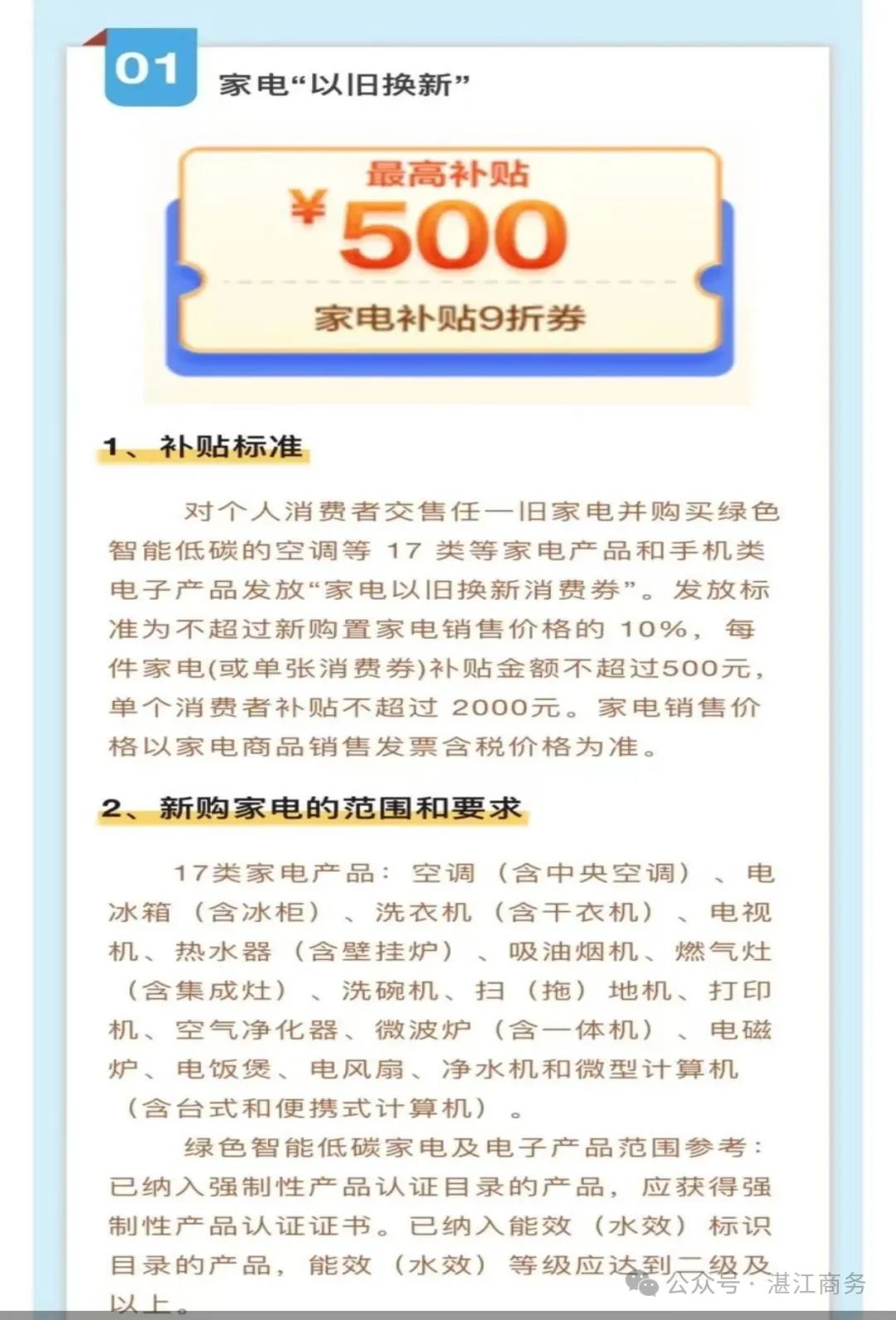 1.湛江市政府补贴 10%,单件家电最高补贴500元,单个消费者最高补贴 2000 元;