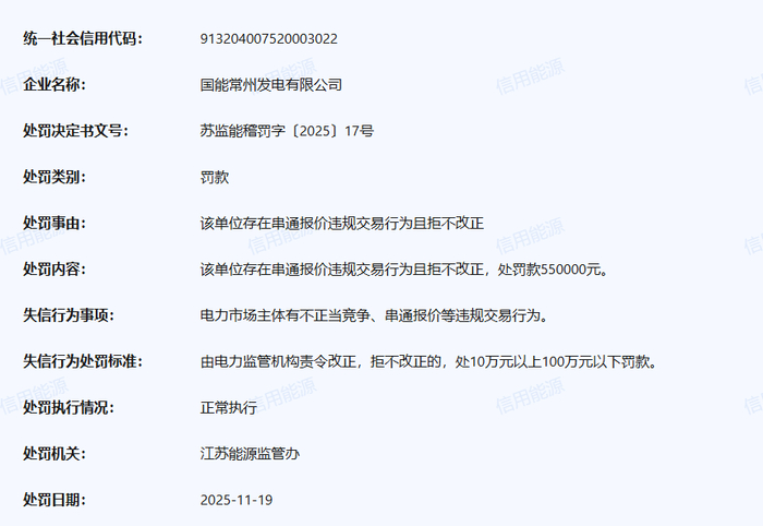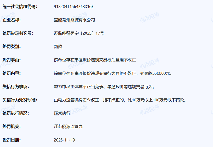 处罚决定由江苏能源监管办开具,处罚决定书文号苏监能稽罚字〔2025〕17号显示,两家单位存在串通报价违规交易行为且拒不改正,各处罚款55万元,合计110万元。