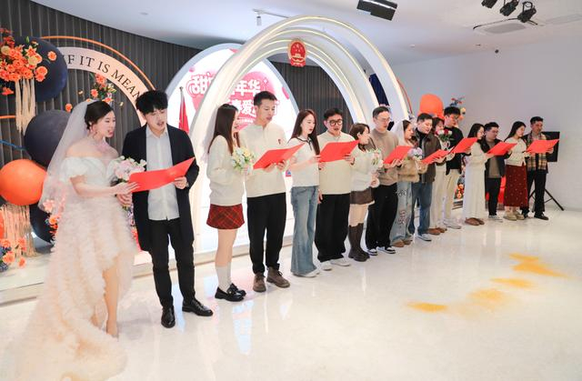 仪式上,8对新人共同参加集体颁证仪式,宣读结婚誓言,并获赠杨浦“甜蜜经济”专属新婚贺礼。